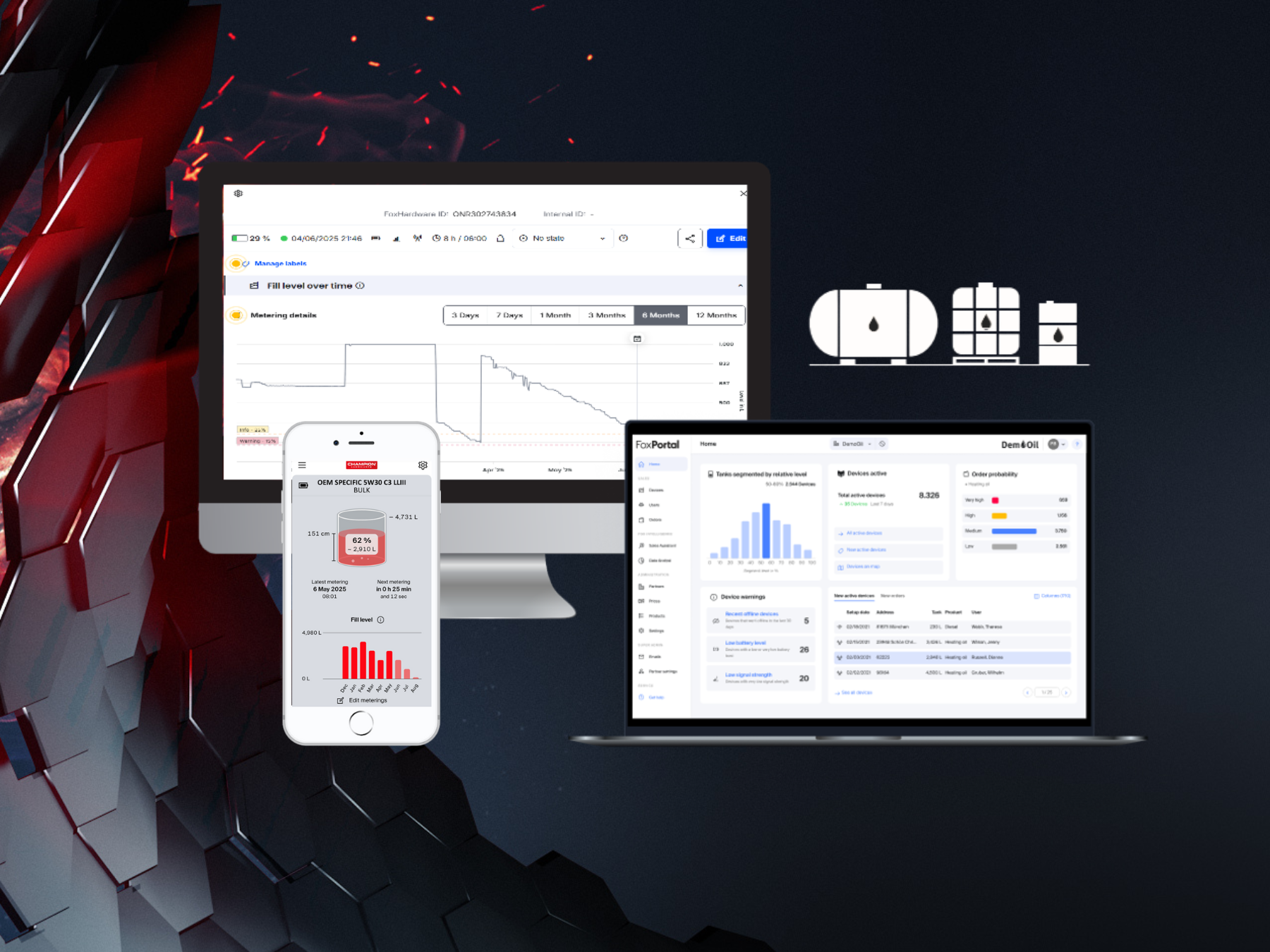 Smart sensors continuously track fill levels and send data to a secure platform. Check your stock on the workshop floor, in the office or on the road. All from your phone or computer.